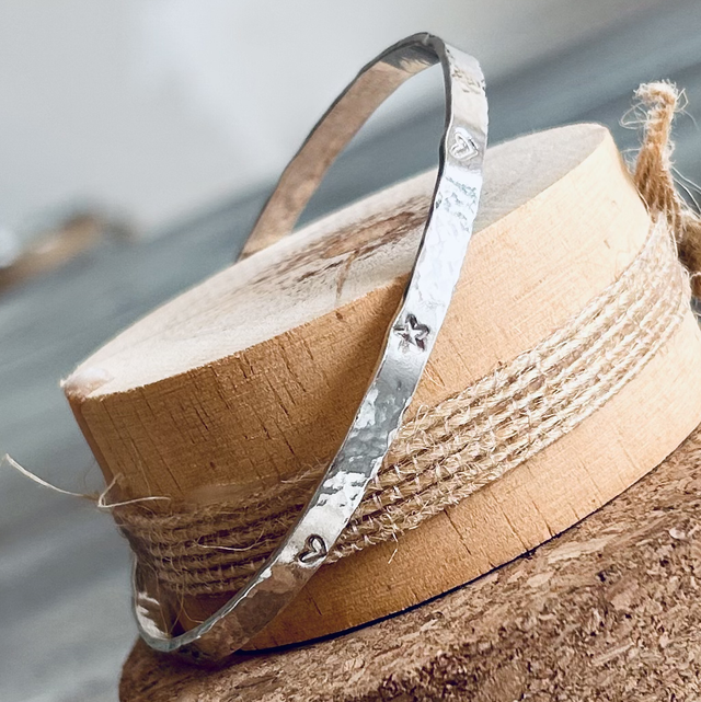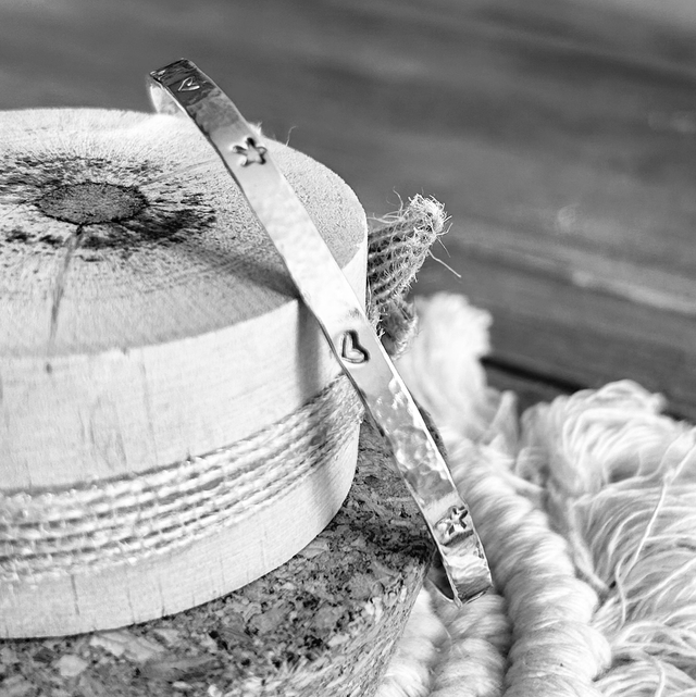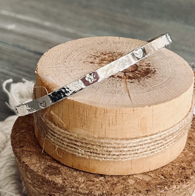 A sweet, hand-stamped bangle with a heart and star — perfect for adding a little love and sparkle to your everyday. Made from sterling silver with a lightly hammered finish for extra shine.